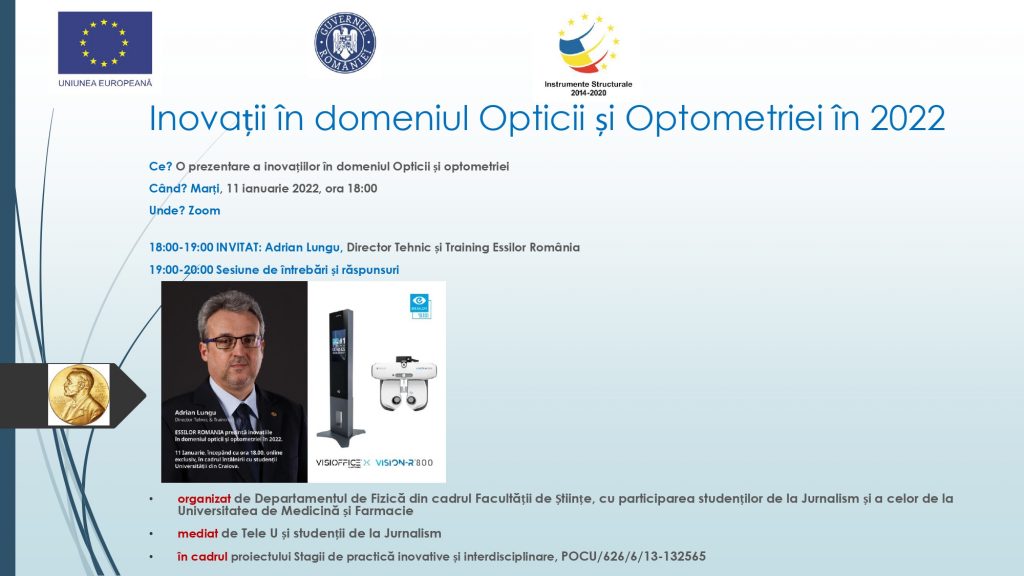 • Inovații în domeniul Opticii și Optometriei în 2022, pregătită și organizată de studenții de la specializarea Fizică medicală sub îndrumarea experților coordonatori. La activitate au participat studenții care fac parte din grupul țintă al proiectului, coordonatorii activități de practică și experții coordonatori de practică și integrare pe piața muncii ai grupelor participante, și care au avut intervenții legate temele abordate.